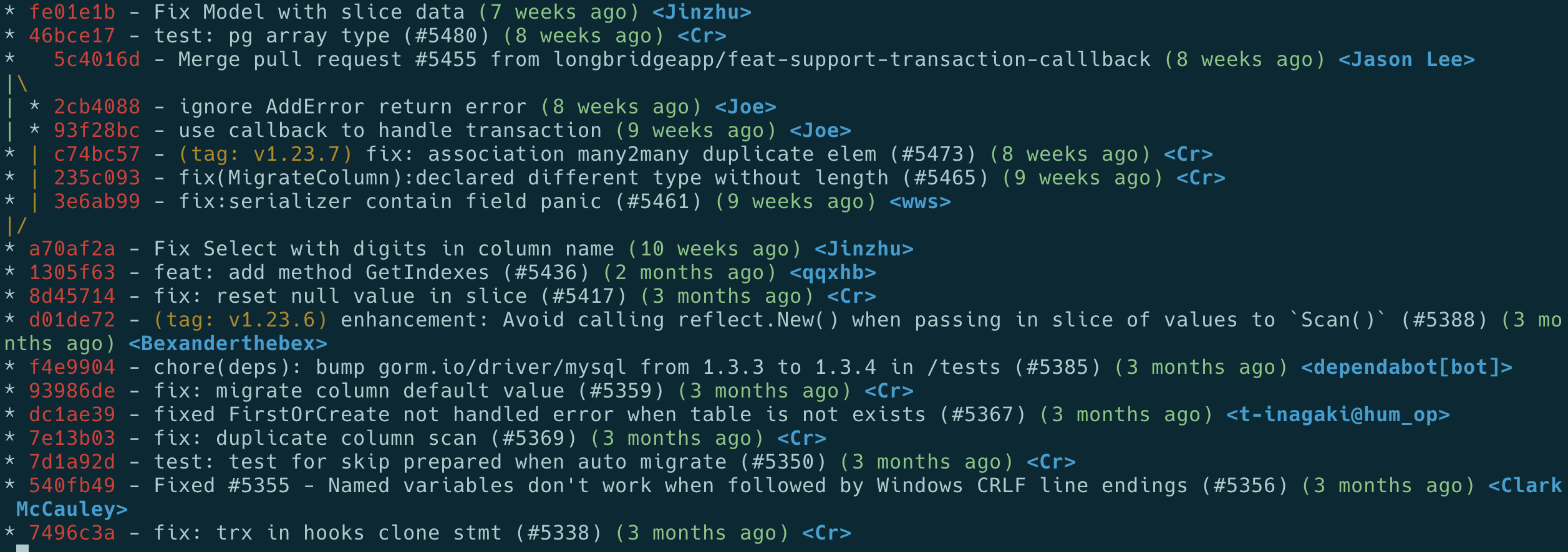 git config --global alias.lg "log --color --graph --pretty=format:'%Cred%h%Creset -%C(yellow)%d%Creset %s %Cgreen(%cr) %C(bold blue)<%an>%Creset' --abbrev-commit"